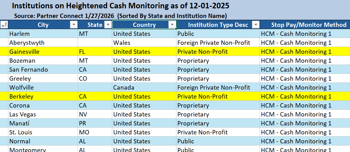 The December 2025 Heightened Cash Monitoring List has been posted by the Department of Education. These lists are supposed to be updated about every three months, but we’ve only had up to June 2025 until very recently, when both the September and December 2025 lists were posted. These lists are the best way to see if there are any schools in trouble, especially for-profit schools that don’t have to submit public audits. Let’s see what’s up!